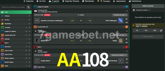 O AA108 oferece uma grande seleção de opções de apostas em e-sports com probabilidades competitivas